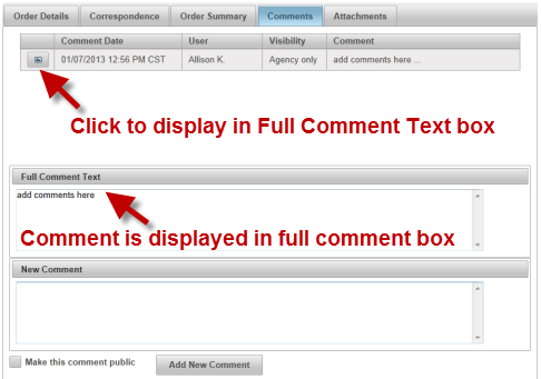 Click on image icon in comment information box to display the complete comment in Full Comment Text box |
