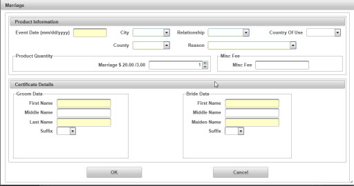 How to Enter Marriage Certificate Data | Information about the certificate(s) is entered into the Certificate Data section. Required fields are shaded in yellow. |