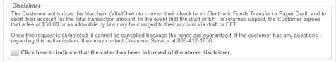 Check Disclaimer Confirmation box indicating the caller has been informed of the Disclaimer
