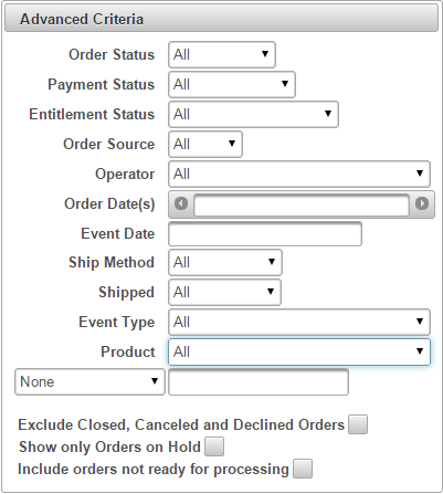 Orders may be searched using Advanced Search Criteria. Advanced Criteria can only be used when at least one type of other search criteria is entered |