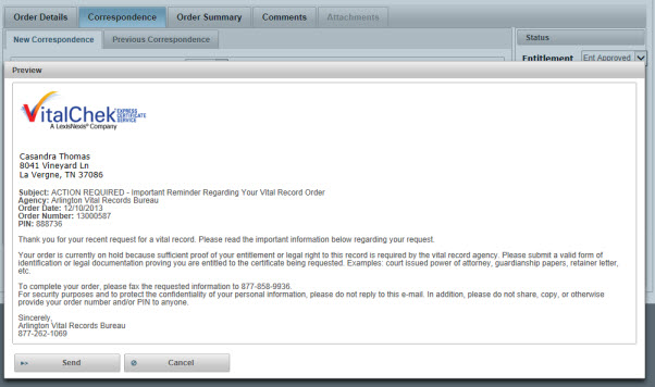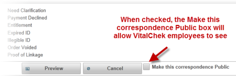 Note - when checked, the Make this correspondence Public check box will allow VitalChek employees to see the correspondence sent