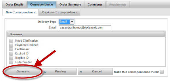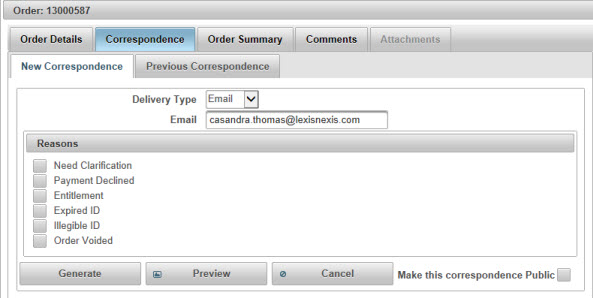 From the Order Details for the order, click Correspondence tab. New Correspondence tab is displayed.