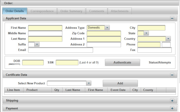 Note - tabs (Correspondence, Order Summary, Comments, Attachments) are grayed out until applicable information is entered |