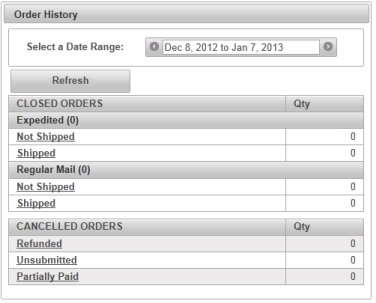 Order History | Order History is a overview of previous order totals organized by Order Status, Shipping and Payment type, based on the Date Range selected. Click the Refresh button to update order information. |