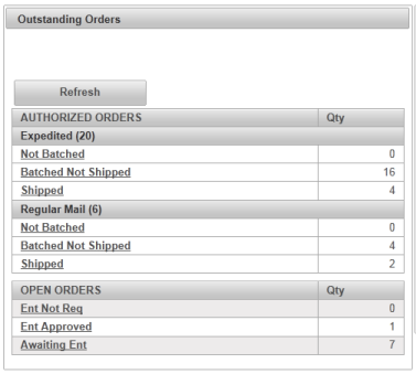 Outstanding Orders | An overview of the outstanding order totals organized by Authorization Status, Shipping Type, and Batch/Shipped Status. Click the Refresh button to update order information. |
